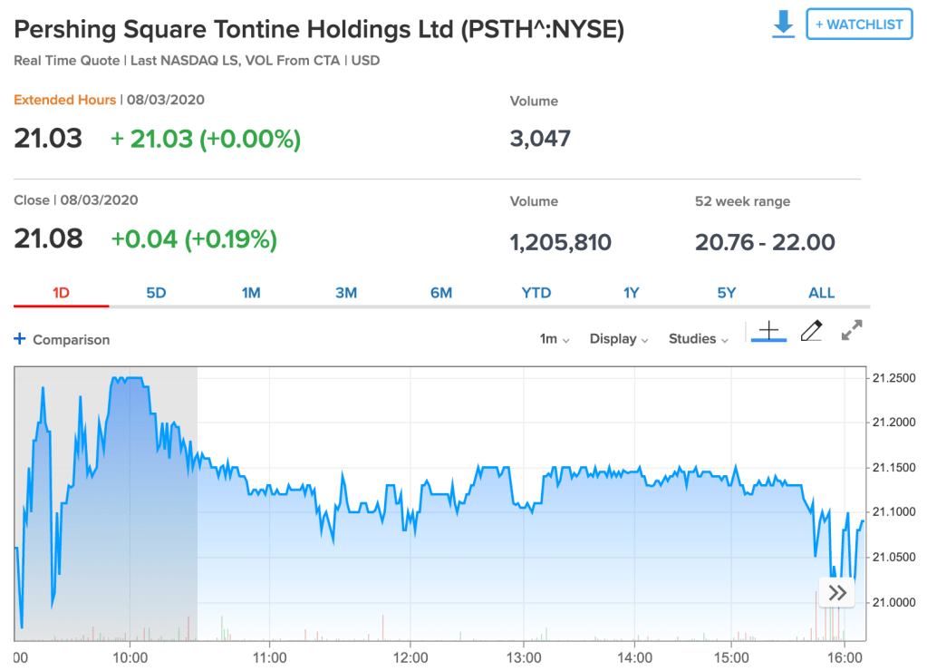 Here’s a snapshot of how the PSTH ticker has performed on the NYSE since its listing on July 22, 2020.